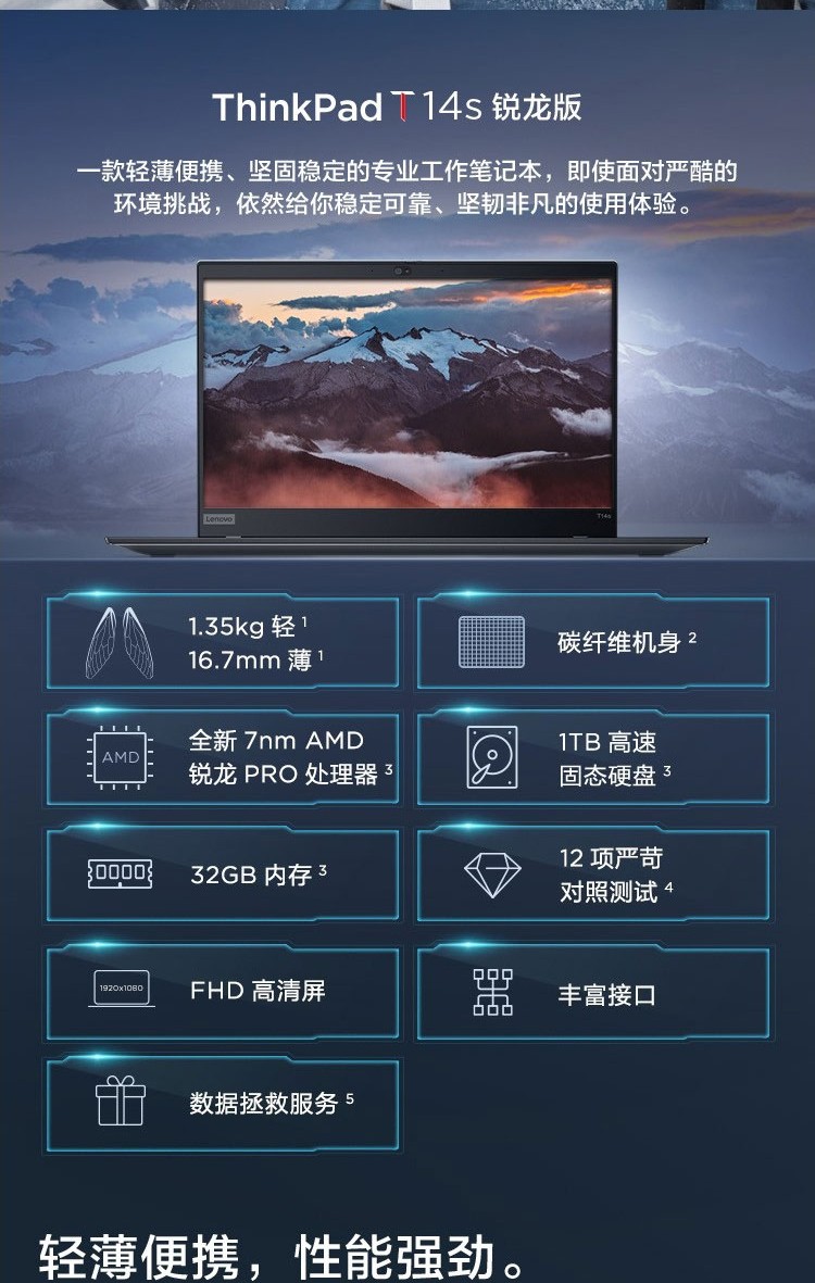 聯(lián)想ThinkPad T14s AMD銳龍八核14英寸碳纖維輕薄高性能辦公筆記本電腦 T14s 08CD:R7 PRO-4750U/16G/512 FHD全高清 指紋識別 Win10 WiFi6
