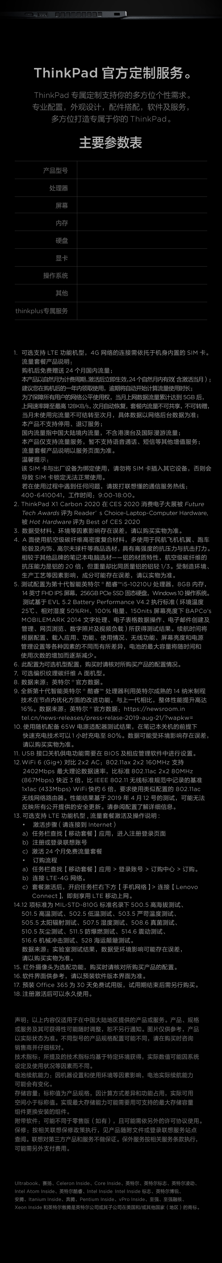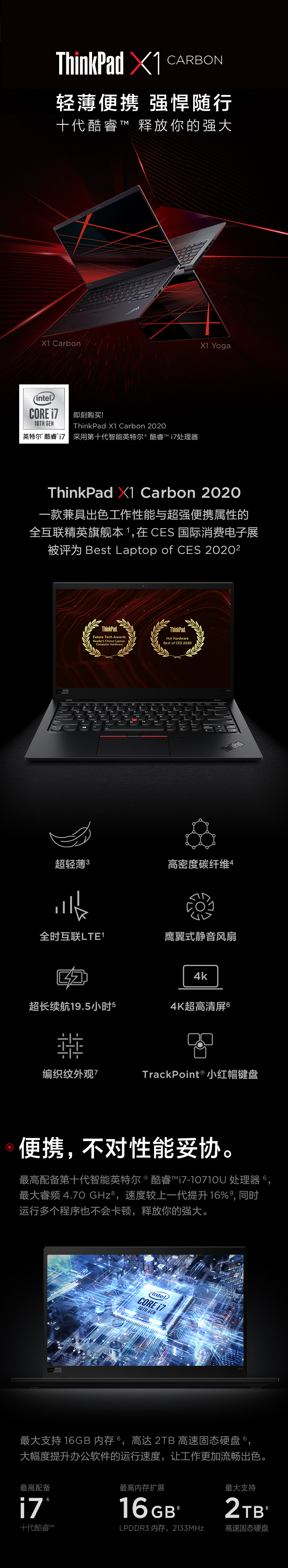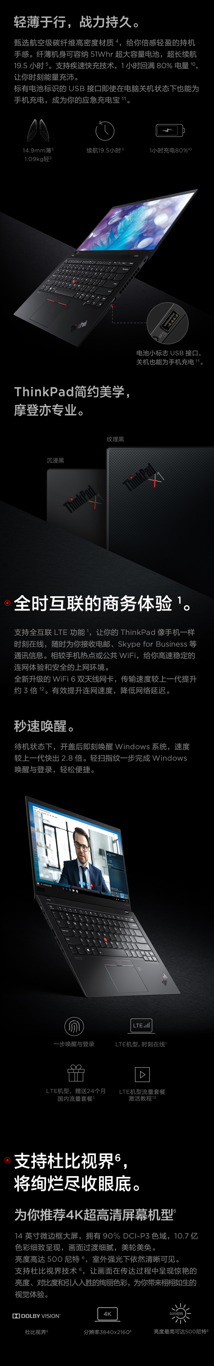 聯想ThinkPad X1 Carbon 2020 7HCD 英特爾酷睿i7 14英寸輕薄筆記本電腦 十代i7 16G 512G WQHD 4G版 沉浸黑