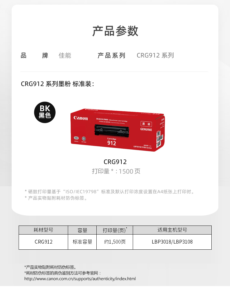 原裝佳能CRG-912硒鼓粉盒 黑色 LBP3018 LBP3108打印機墨盒 碳粉盒耗材 佳能 CRG-912 硒鼓(約1500頁) 官方標配
