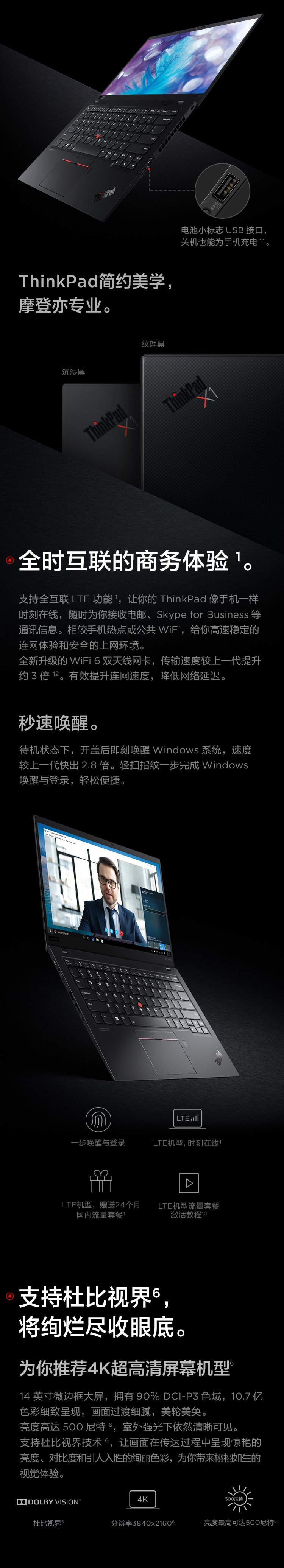 聯(lián)想ThinkPad X1 Carbon 2020 7FCD 英特爾酷睿i5 14英寸輕薄筆記本電腦 十代i5 16G 512G 4G版 沉浸黑
